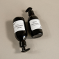 - Amber glass bottle with a paper label and PET plastic dispenser pump.