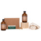 - Recyclable amber glass bottle with a paper label, recyclable kraft box.